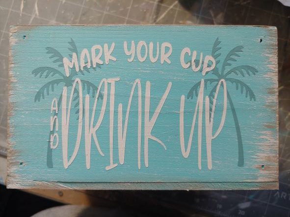 – It has the phrase, Mark your Cup and Drink up painted on the front with white paint.