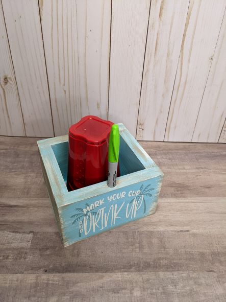 Beach Palm Trees cup holder is the perfect wooden cup holder for parties and more at the beach house. Simply fill it with your favorite plastic cups and place a marker into the hole and your party guests can mark their cups easily.