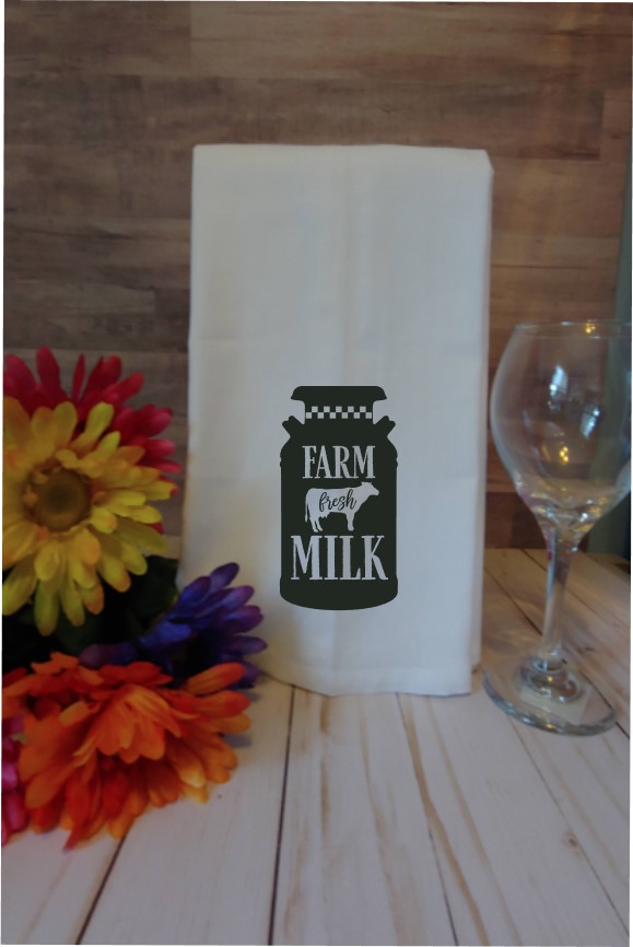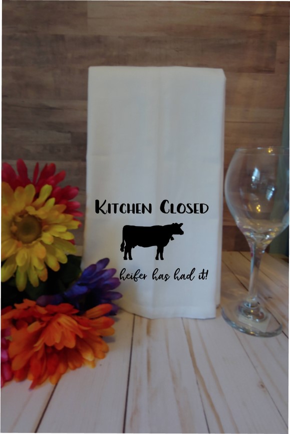 Tea towels or flour sack towels are a quaint and versatile addition to any kitchen. This set of flour sack towels has a farmhouse style with a cow on one stating “Kitchen Closed…this heifer has had it” and the other is a milk container with “Farm fresh Milk”. This set comes in black on a white towel. These towels make a great gift idea for a house warming gift or a hostess gift or a great gift for friends and family, or to keep for yourself. Lone Wolf Craft Studio prides ourselves on selling quality products. These kitchen towels are food safe and durable.