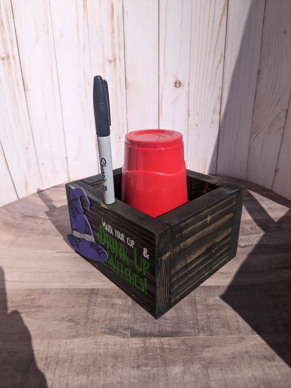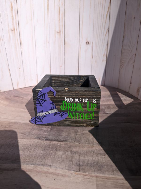 Mark your Cup and Drink Up Witches – Wooden Cup and Marker holder – Party supply -Makes the perfect gift for him, her, or bring it with you to your friend’s party and leave it for them.