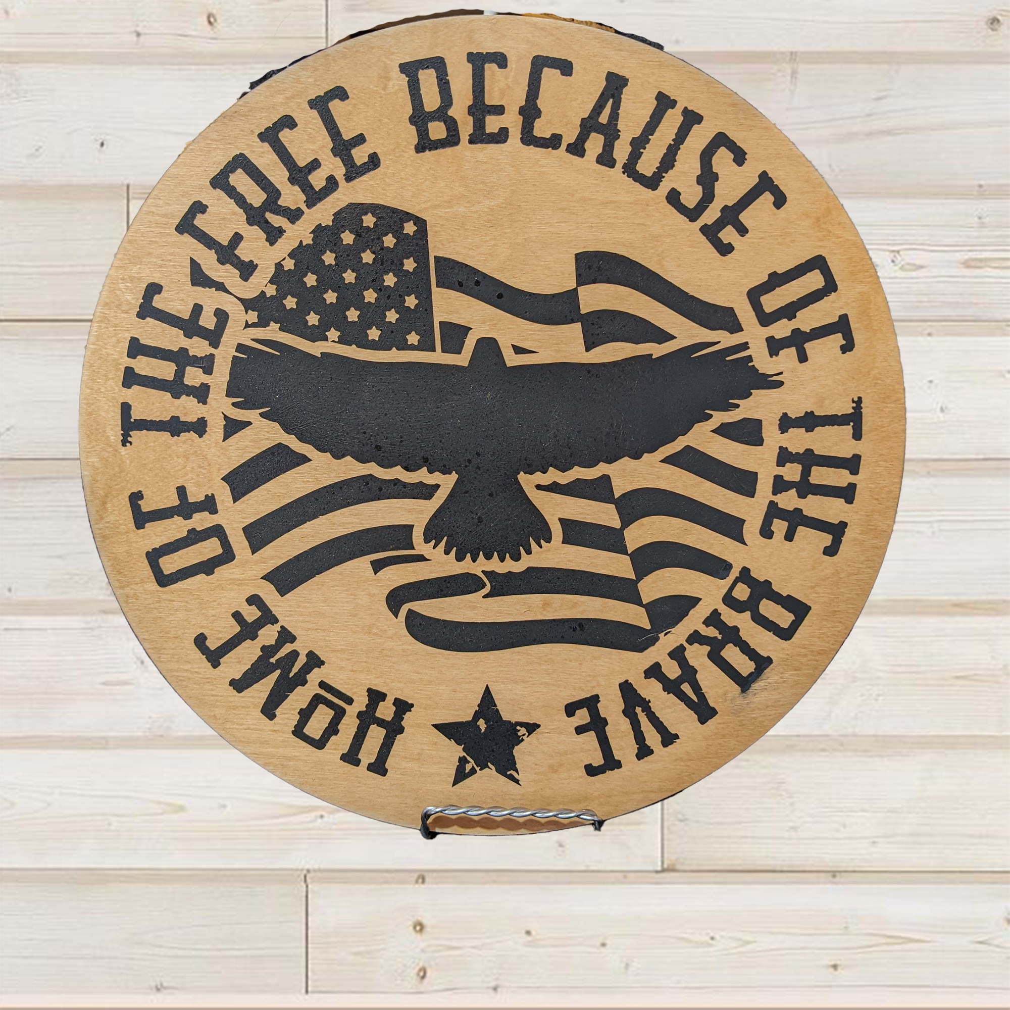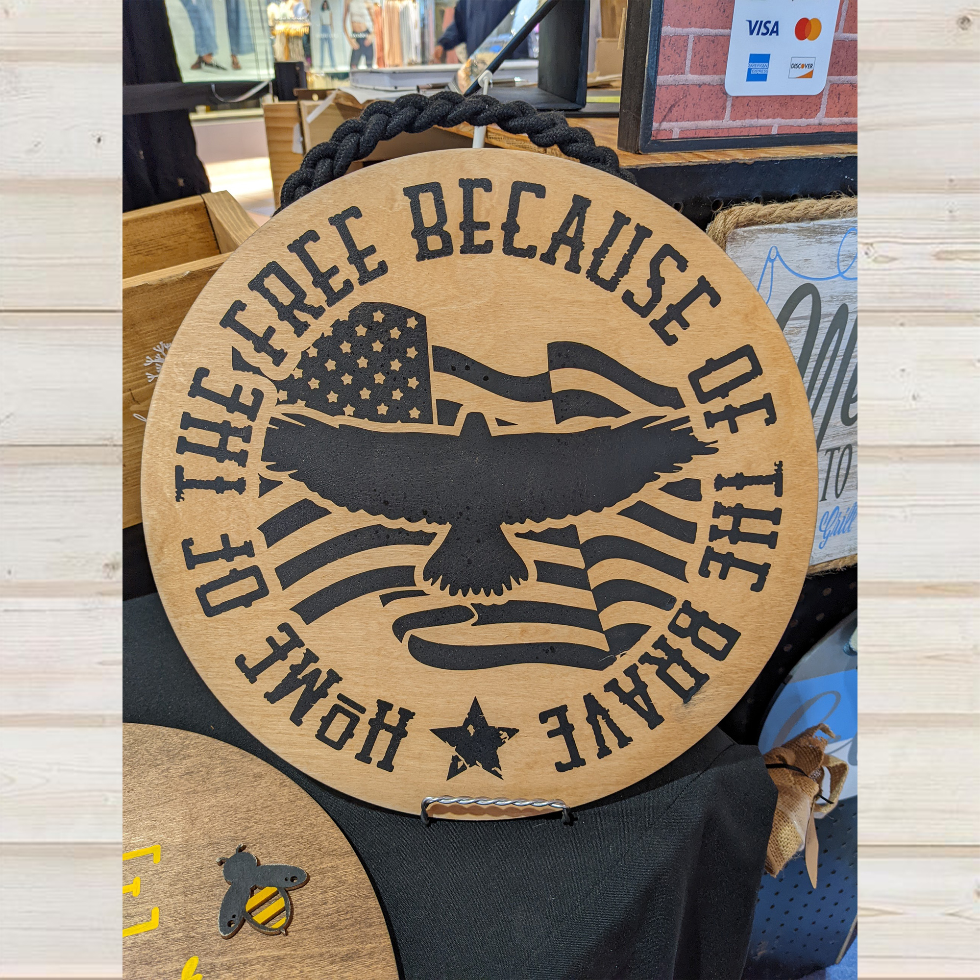 Home of the Free Because of the Brave Round sign on 1/4 birch. Features a black rope to hang with. 12 inch round
