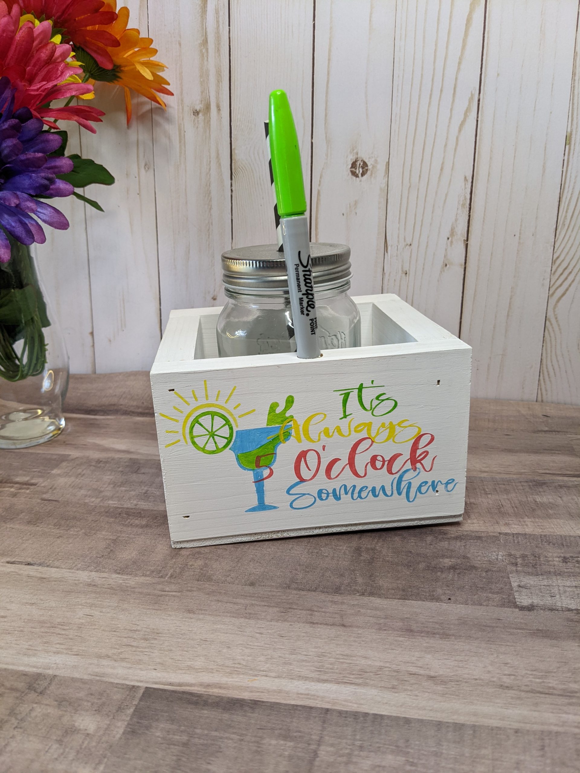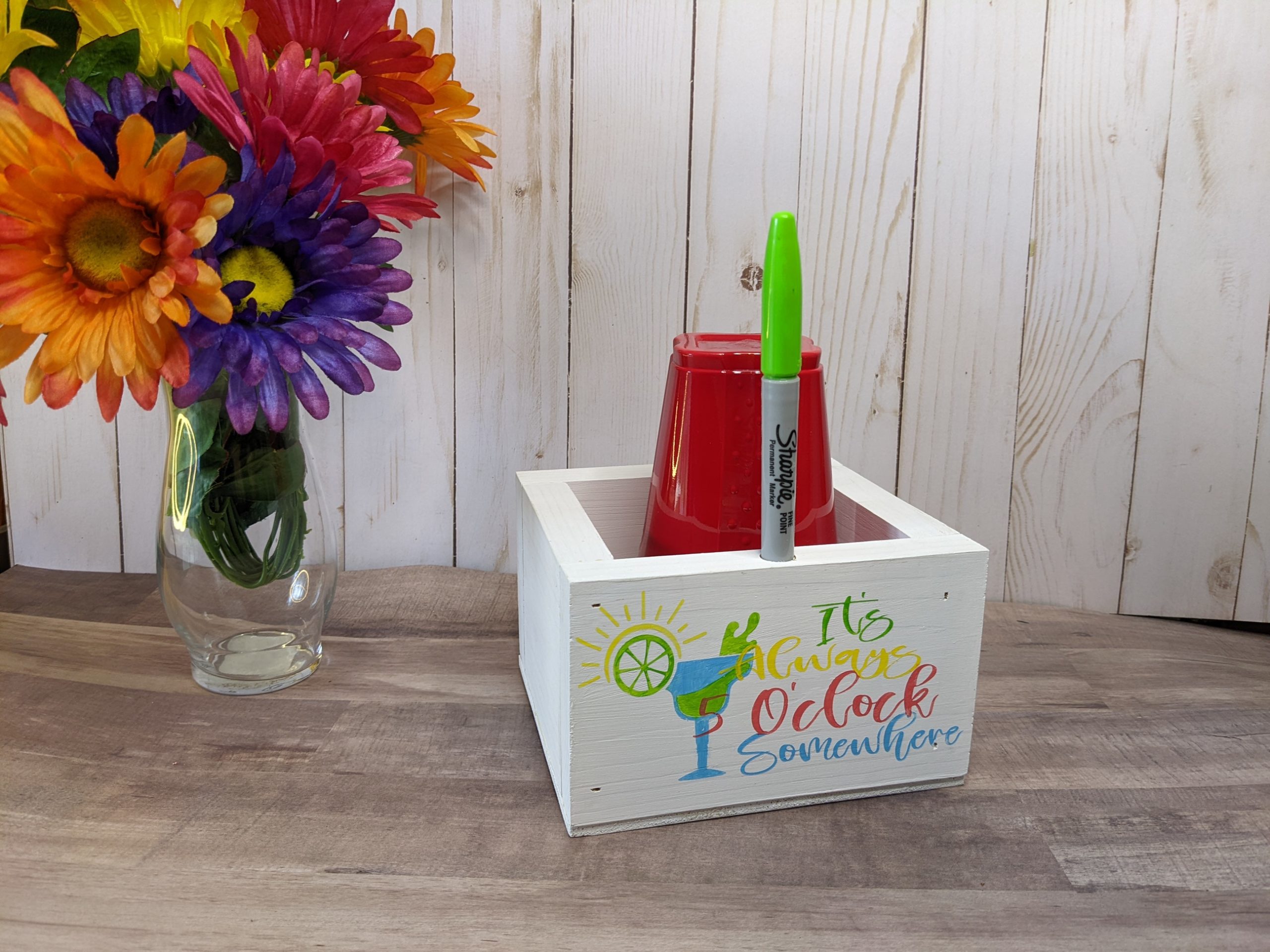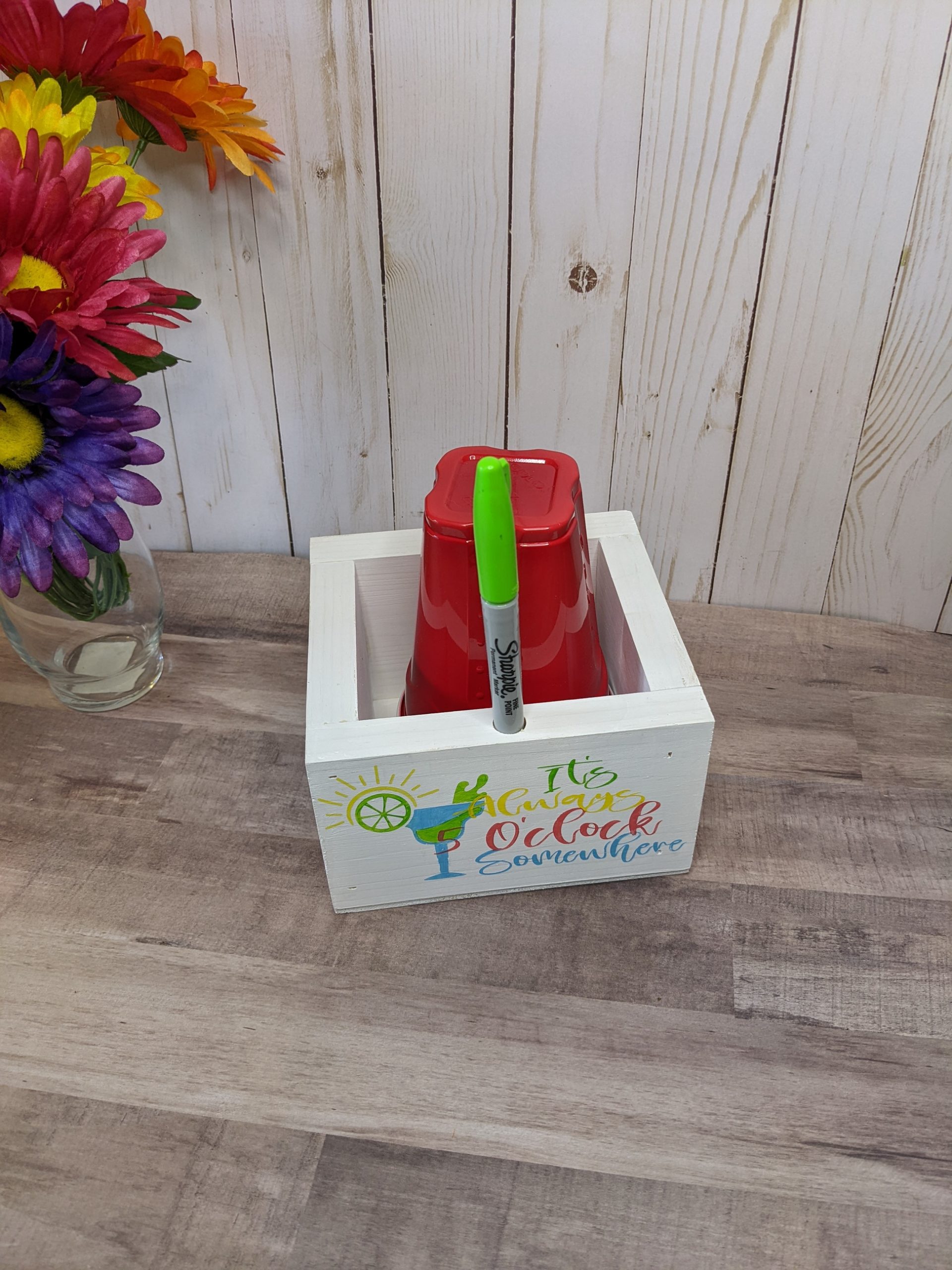 It’s Five O’Clock Somewhere – Wooden Cup and Marker holder – Party supply -Makes the perfect gift for him, her, or bring it with you to your friend’s party and leave it for them.