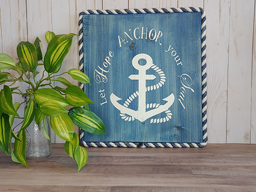 You will love this hand-painted nautical themed wood sign with an anchor saying “Let hope anchor your soul“. This sign is stained in the color of your choice, then painted with antique white words and anchor. To complete the look we add blue and white rope piping around the edges of the wood. Comes ready to hang on your wall in your mancave, nautical room, or any room that you may choose.