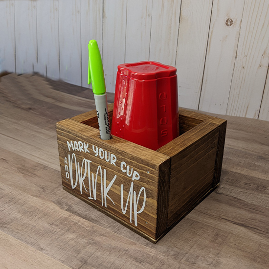 It’s finally here! The Mark your Cup and Drink Up cup holder is the perfect wooden cup holder for parties and more. Simply fill it with your favorite plastic cups and place a marker into the hole and your party guests can mark their cups easily.