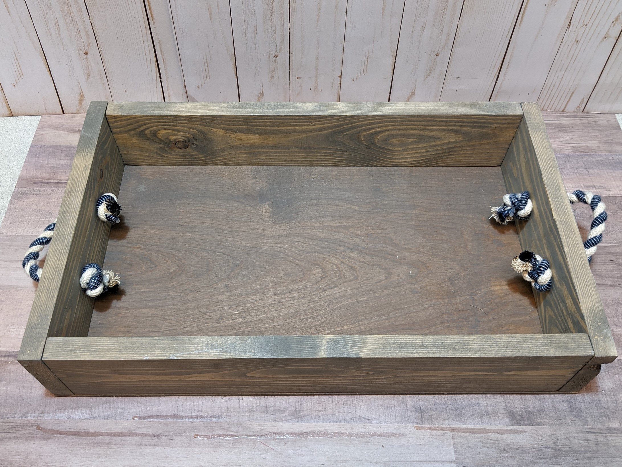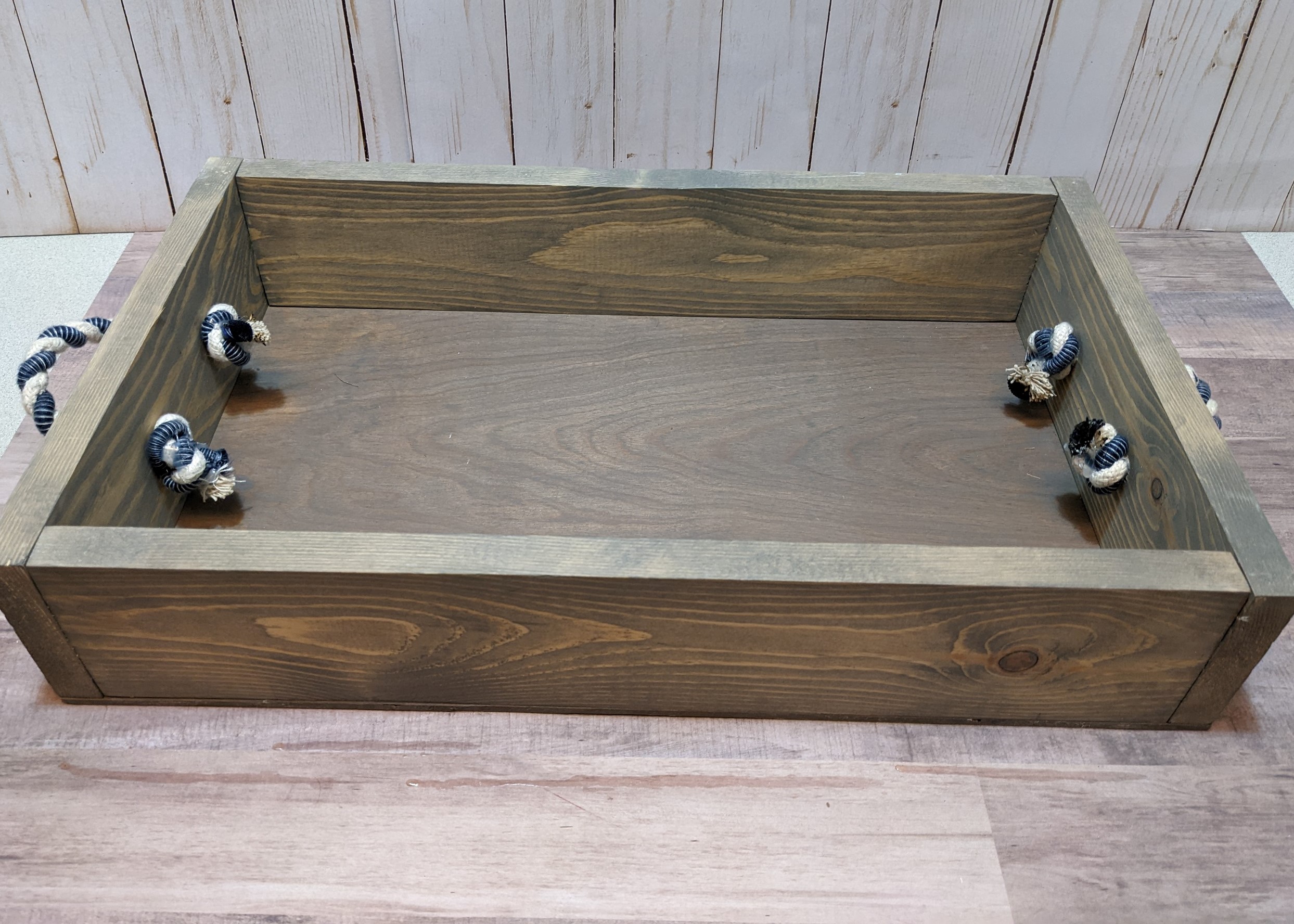 Our Rustic tray measures 18.5 long, 11 inches wide, and stands 4 inches tall. The box weighs in at three pounds and is made from sturdy spruce and finished in a gray stain that has been whitewashed.