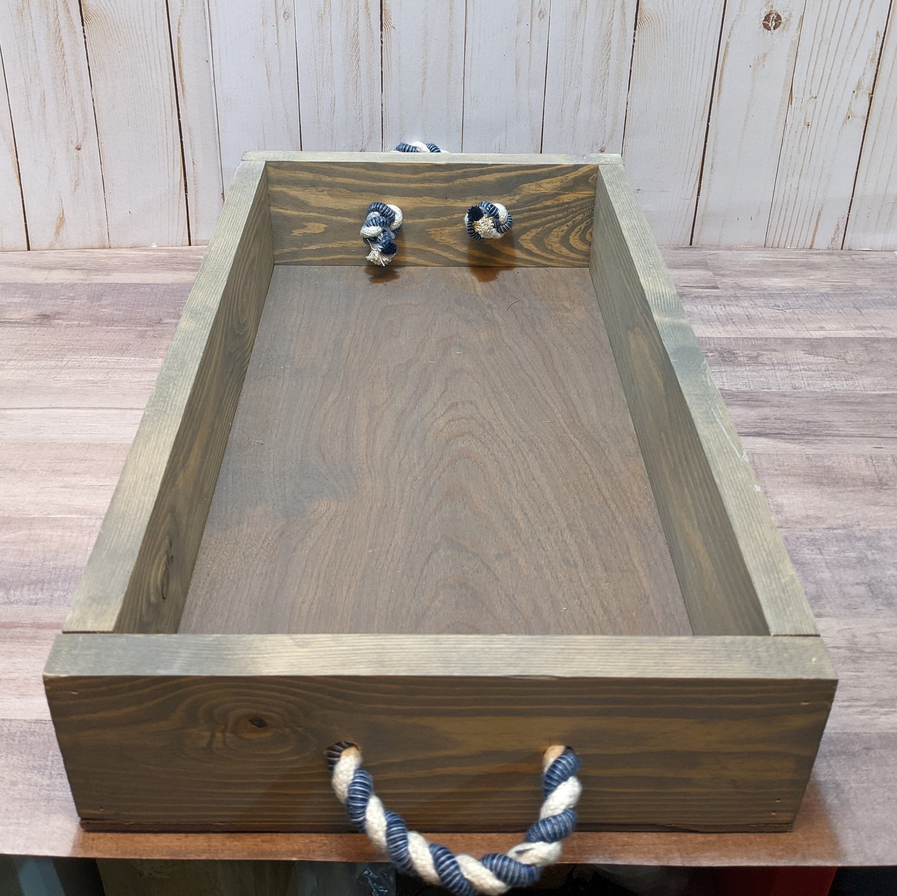 Our Gray whitewashed wooden serving tray features a nautical blue and white rope handle. Perfect for carrying snacks from the kitchen to the ottoman or out to the back deck.