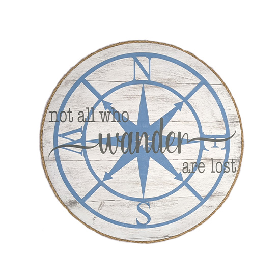 Not all who wander are lost. 18″ diameter sign with a rope border.