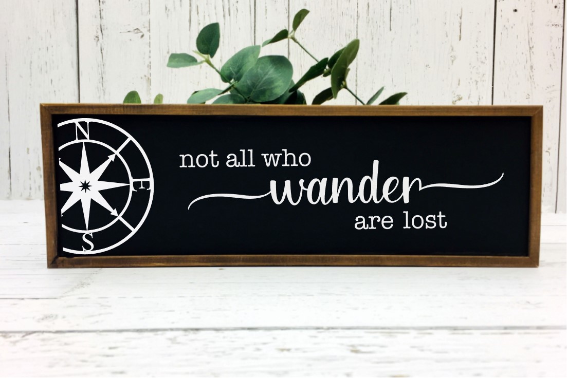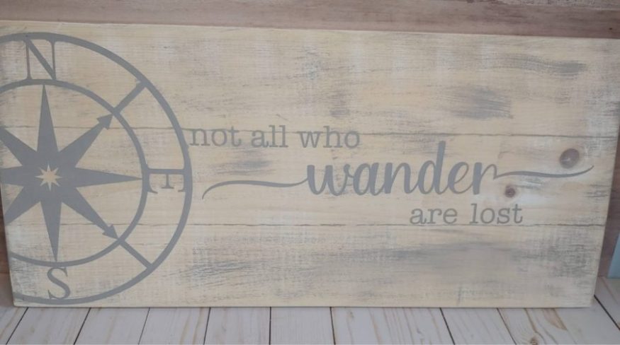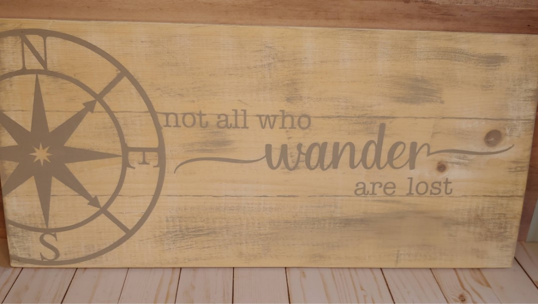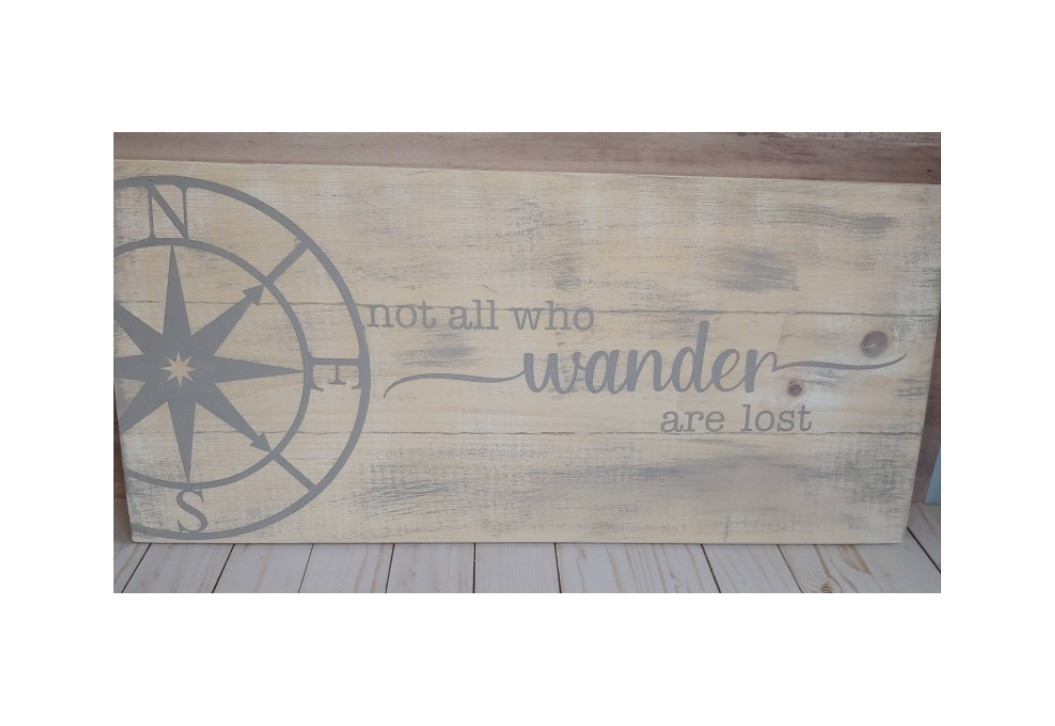 Custom made wood sign saying “Not all who wander are lost” with a partial compass. This sign is available in different sizes and colors to suit your needs.