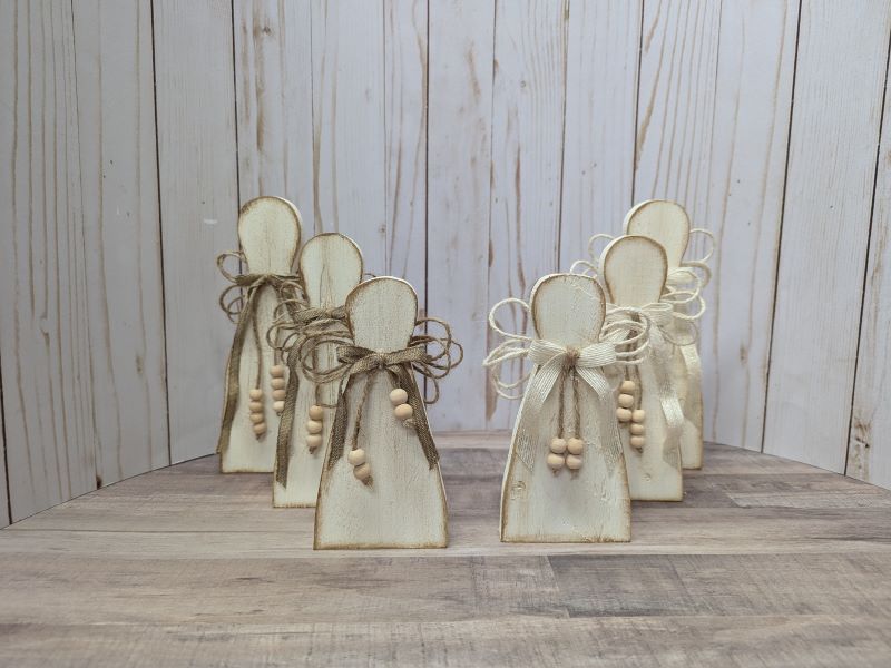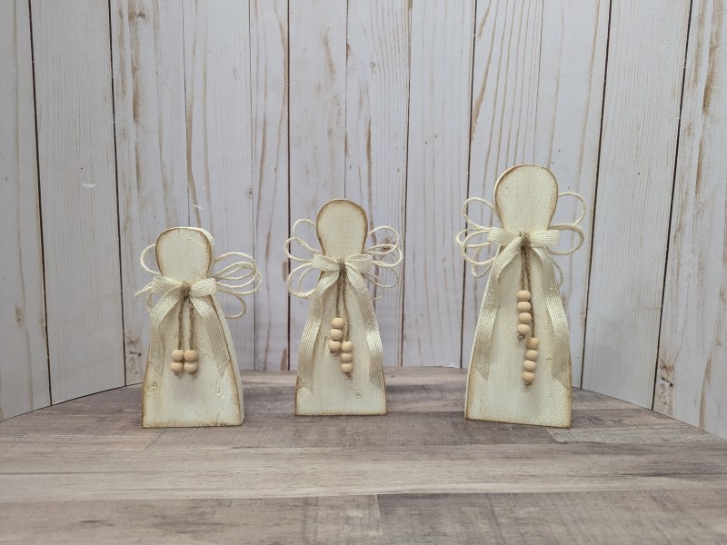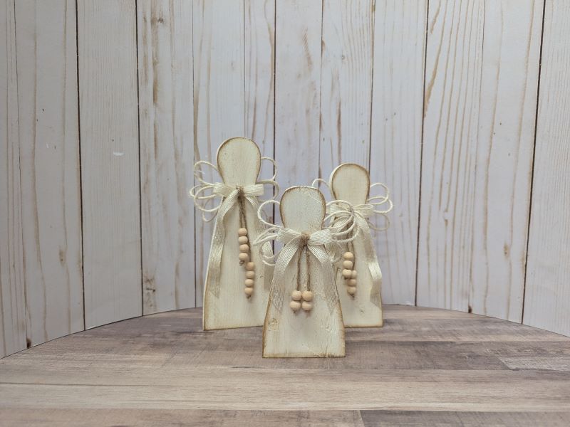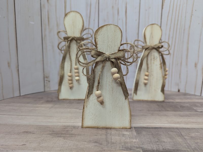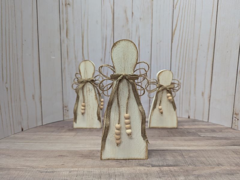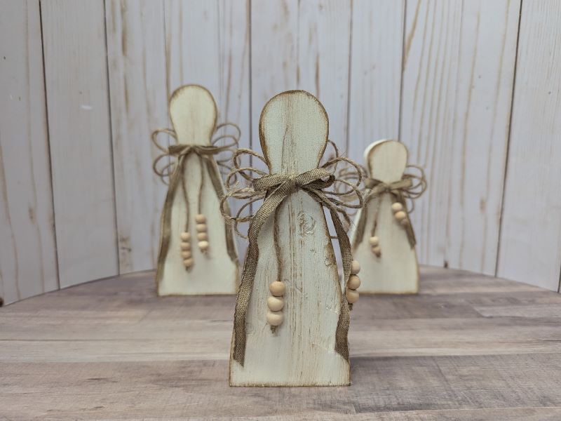 Elevate your home decor with the enchanting presence of our Rustic Pine Angel Trio. These handcrafted wooden angels, finished in a distressed white for a vintage appeal, are adorned with jute bows and natural wood beads for a touch of rustic charm.