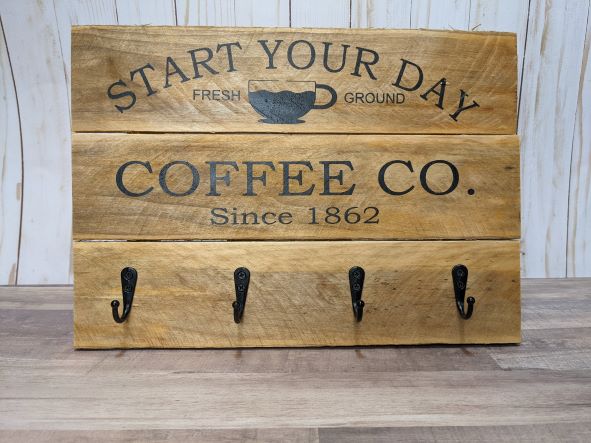 This rustic sign is perfect to hang by your coffee pot. Feature four hooks to hang your favorite coffee cups from. Made from recycled hardwoods that will stand the test of time.