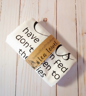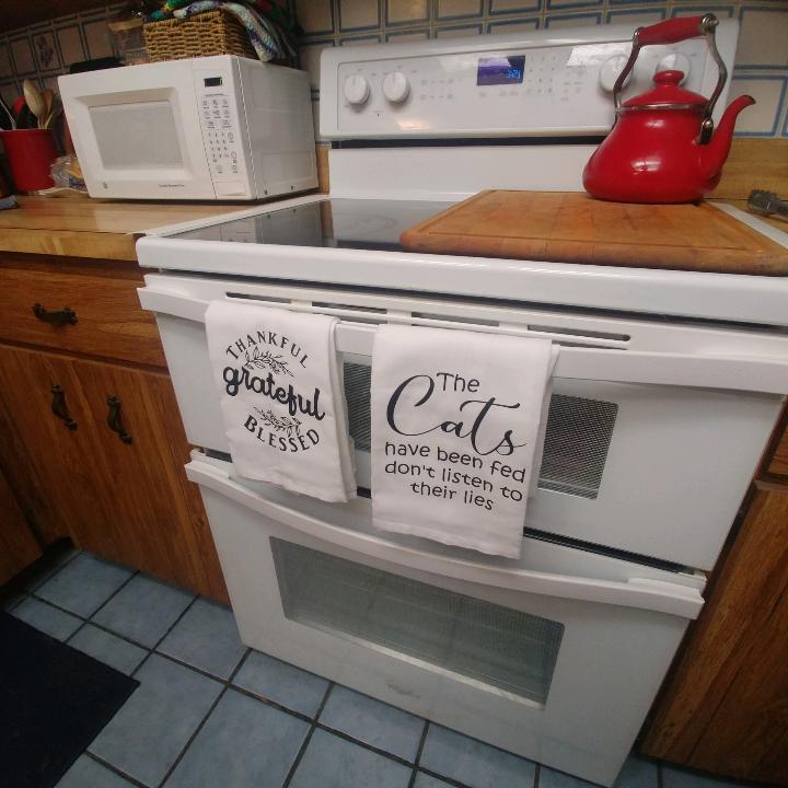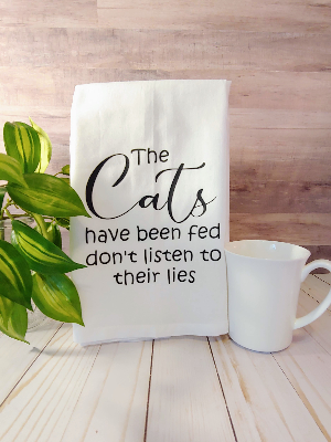 “The cats have been fed don’t listen to their lies” flour sack towel is a wonderful addition to your kitchen. These farmhouse style flour sack towels are durable enough to use everyday in your kitchen and also stylish enough to show off for your guests. These modern day farmhouse style towels are white with black flexible vinyl lettering so that the flour sack towel moves and is not stiff. The size of the towel is 30 inch by 30 inch and the image is centered on a trifold to hang nicely on your oven or towel rack.