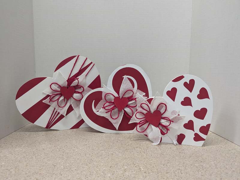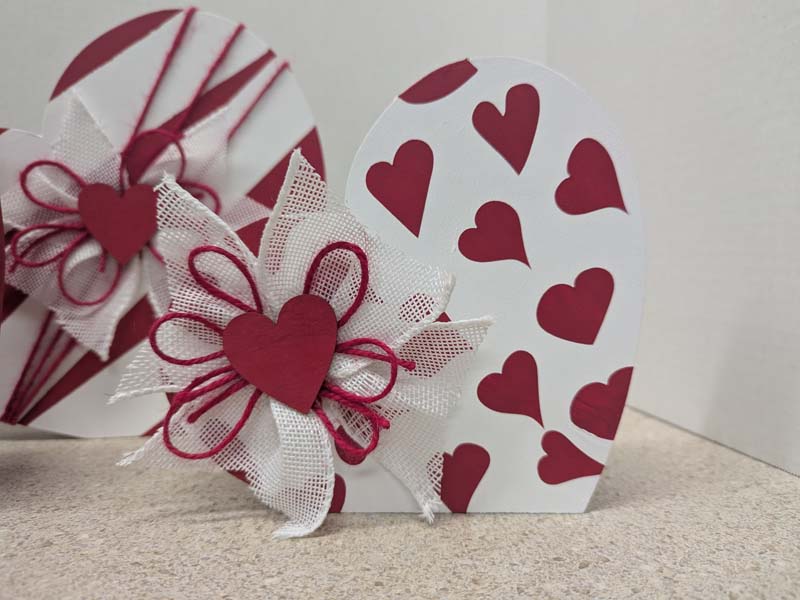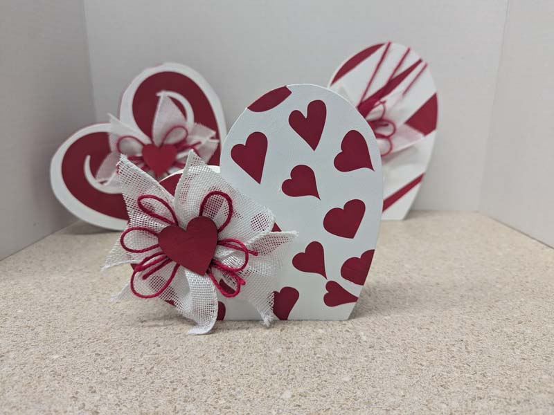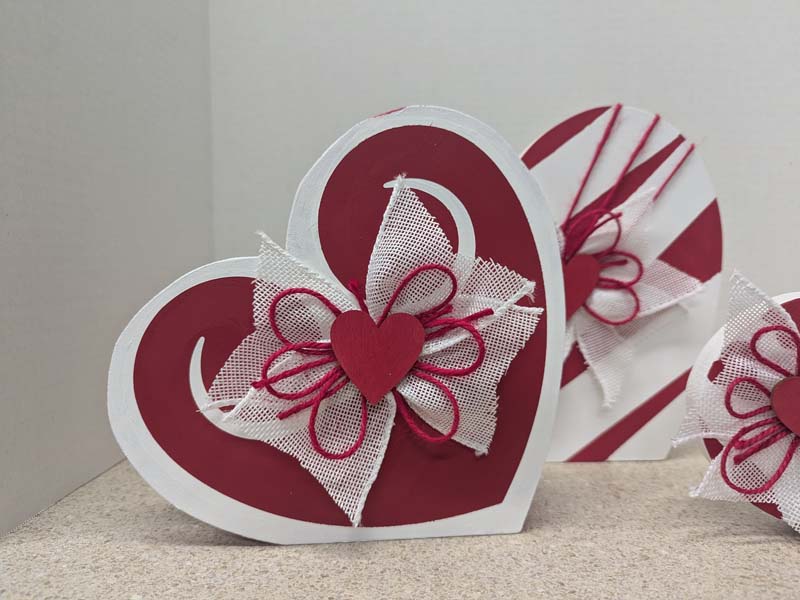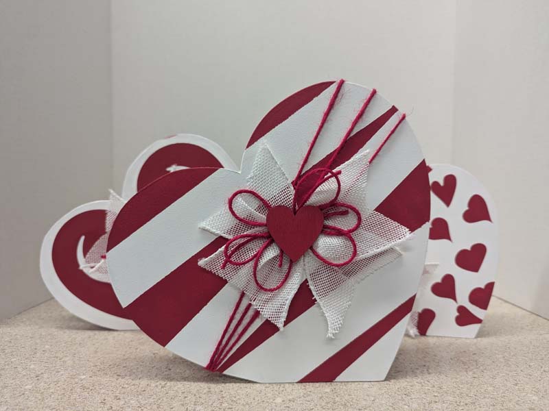 - Large Heart: A large heart with bold stripes painted in red and white, accented with a white and red bow and a delicate heart embellishment.