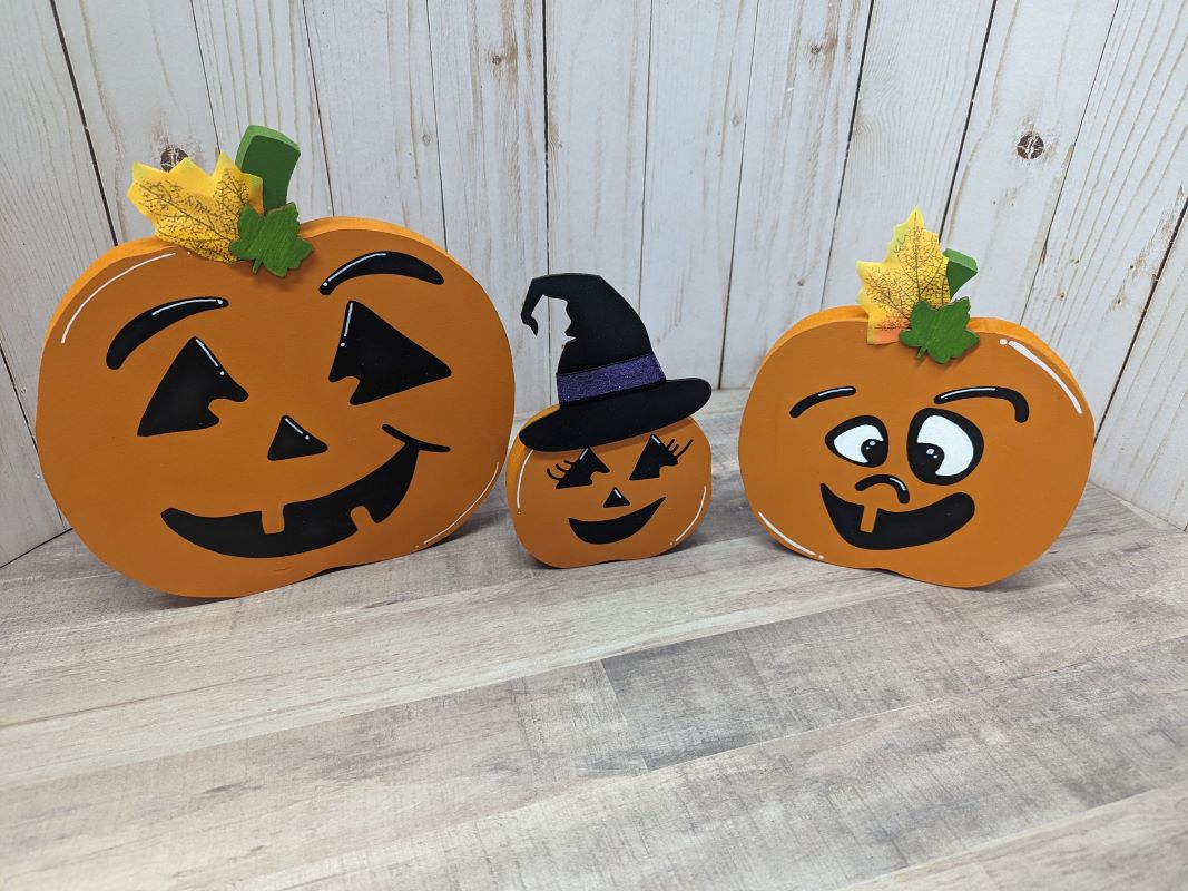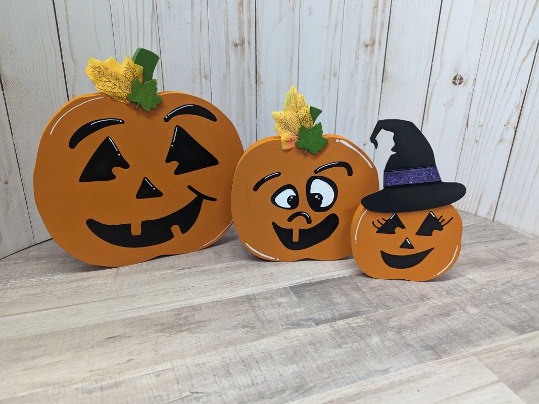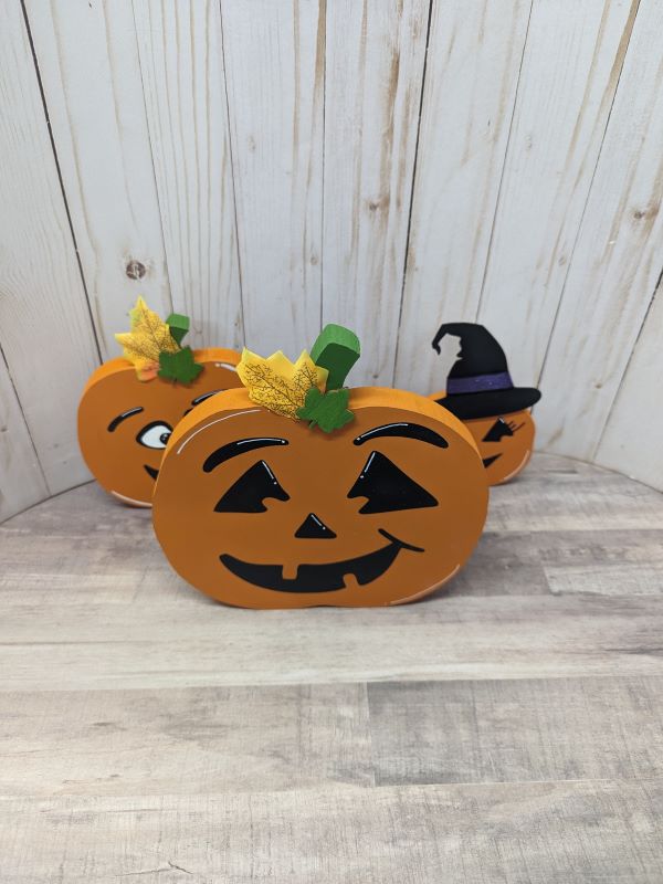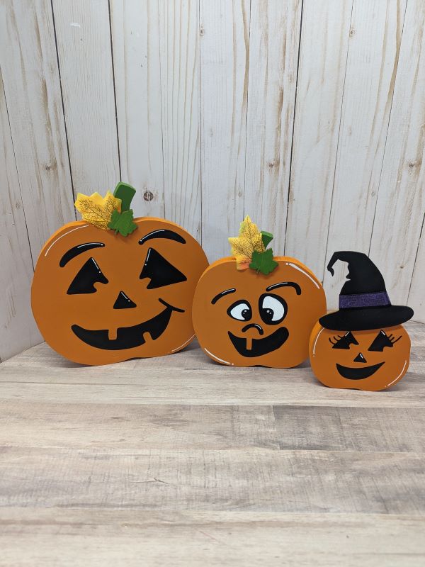 * This listing includes a set of 3 wooden jack-o’-lantern pumpkins in various sizes: