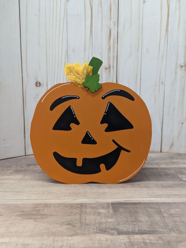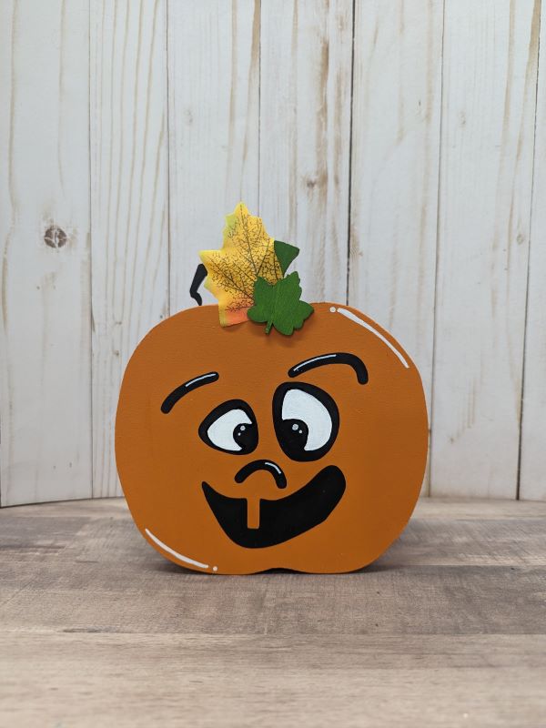 * Medium pumpkin (approximately 7 inches tall x 6 inches wide) – featuring crazy eyes and adorned with a unique combination of a green wooden leaf and a fabric leaf.